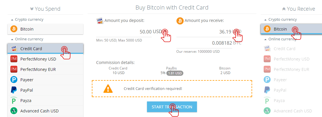 3. Visit Paybis.com and choose Credit Card in “You Spend” (left column) and Bitcoin in “You Receive” (right column).