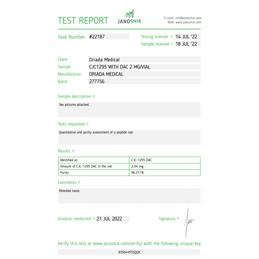 - Product and Laboratory: CJC-1295 DAC by Driada Medical