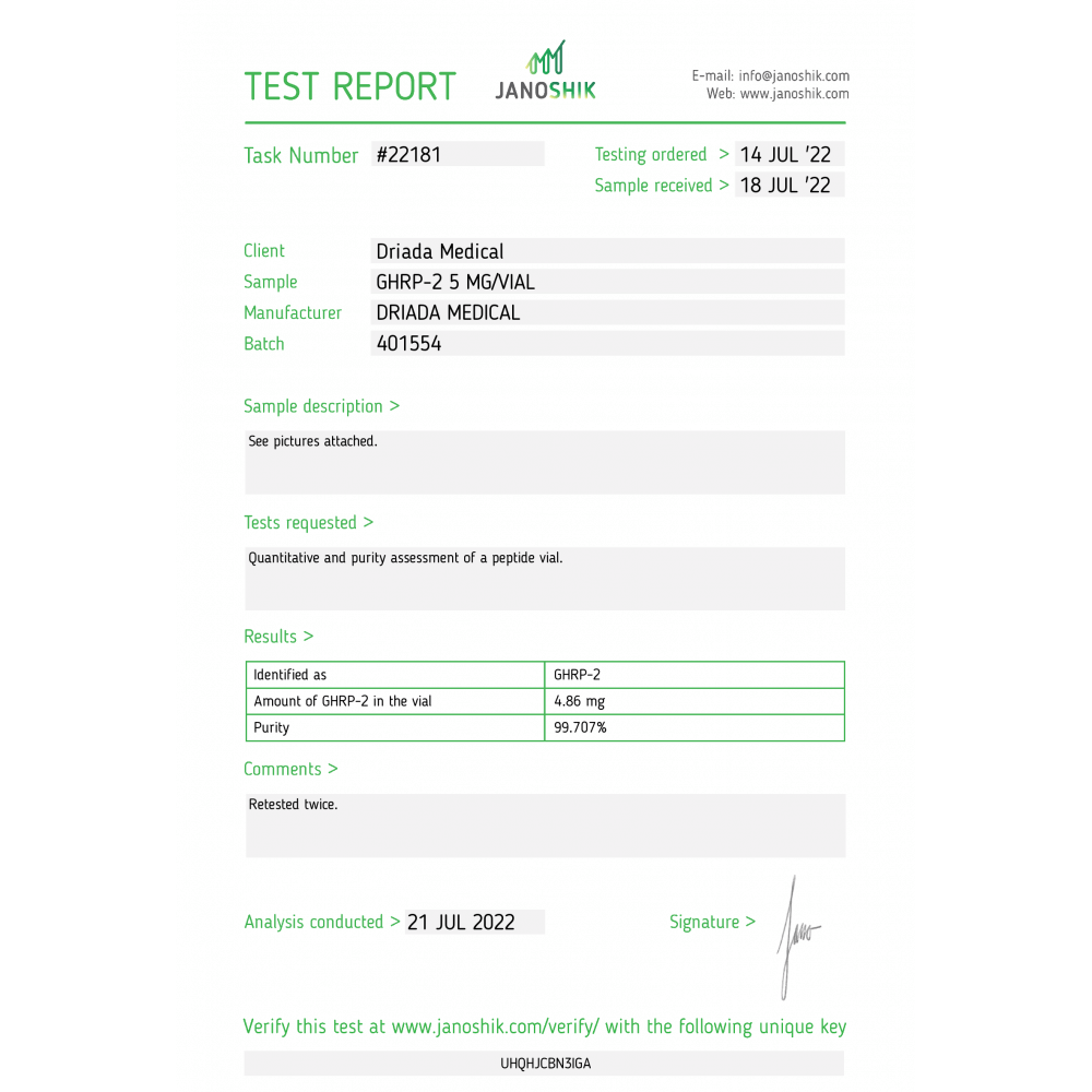 Driada Medical’s GHRP-2 is an HGH secretagogue which releases not only growth hormone, but also prolactin (testosterone secretion) and cortisol (metabolic regulation). GHRP-2 will raise the body’s plasma levels of growth hormone.