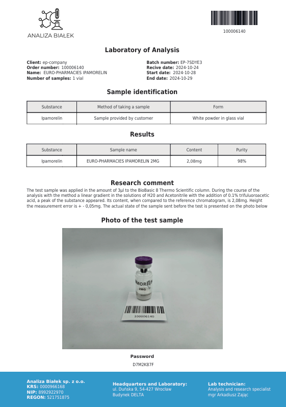 - Product and Laboratory: Ipamorelin by Euro Pharmacies