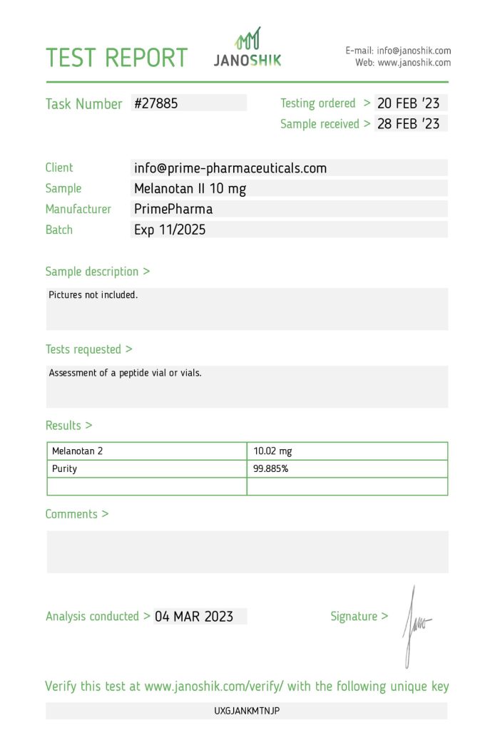 - Product and Laboratory:Â MELANOTAN 2Â by Prime Pharma