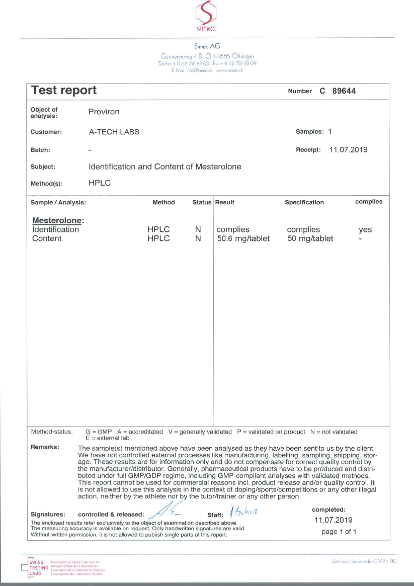 - Product and Laboratory:Â Mesterolone (Proviron) by A-Tech Labs
